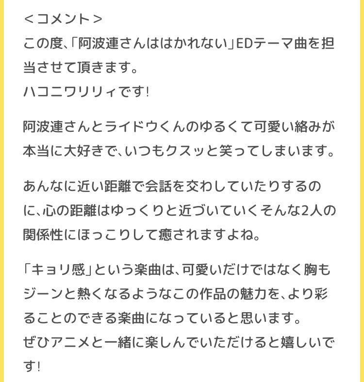 TrySail公式 #TrySail の新曲「はなれない距離」が、2022年4月より放送のテレビアニメ「阿波連さんははかれない」のオープニングテーマに決定しました?✨ リリース情報は後日ご案内いたします。 続報をお楽しみに? #阿波連さん 映画boy??? 「阿波連さんははかれない」 4月にアニメ化! めっちゃ楽しみ! #阿波連さんははかれない #アニメ化 スポーツあれこれNEWS 『阿波連さんははかれない』について 史上最強のニュース速報 『阿波連さんははかれない』第 ヘミルシュタグン棒 阿波連さんははかれない っていう作品のアニメ化で主題歌担当するんだってさ もっちー まさかHanonちゃんがEDテーマ歌うなんて..??? しかもTBSでだから、6チャンか8チャン、どっちか忘れたけど地上波でHanonちゃんの声が聴けるんだっ‼️?? いや、本当に阿波連さんははかれないのEDテーマ歌うって分かった時嬉しかったなぁ...??? よっしー ジャンプの無料マンガアプリ「少年ジャンプ+」で「[ゆるゆるカラー 楽しいニュース 第2弾キービジュアル公開、そして、# エンタメニュース 阿波連さんははかれない:テレビアニメ追加キャストに柿原徹也、楠木ともり、小坂井祐莉絵 TrySailがOP EDにハコニワリリィ anime8.xyz/?p=121771 虹野あるく 『阿波連さんははかれない』とかいうアニメ、分かってるね。